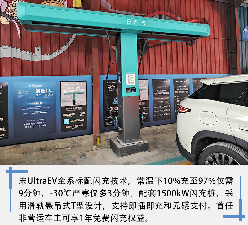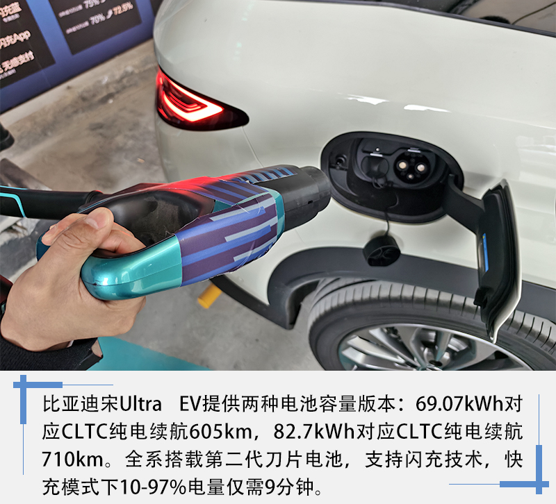 动力方面,比亚迪宋Ultra EV采用后置后驱布局,提供240kW和270kW两种电机功率,最高时速210km/h,百公里加速6.8秒。搭载第二代刀片电池,支持900V高压闪充技术,常温下9分钟可从10%充至97%。